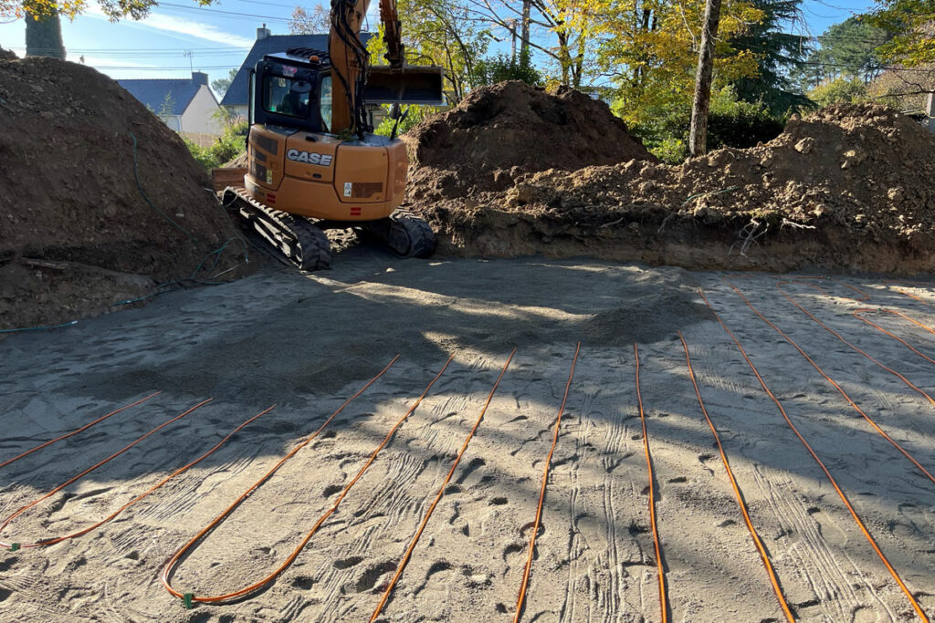En complément de nos travaux d’assainissement et de raccordement, Sansoucy Travaux Publics réalise le terrassement nécessaire à l’installation de capteurs de géothermie. Ttranchées, mise en forme du sol, respect des profondeurs et des distances techniques, gestion des déblais… Notre expertise en terrassement garantit une implantation fiable et durable de votre système géothermique, qu’il s’agisse de capteurs horizontaux ou verticaux. Une solution performante et écologique pour optimiser le chauffage de votre habitation tout en préservant votre terrain.